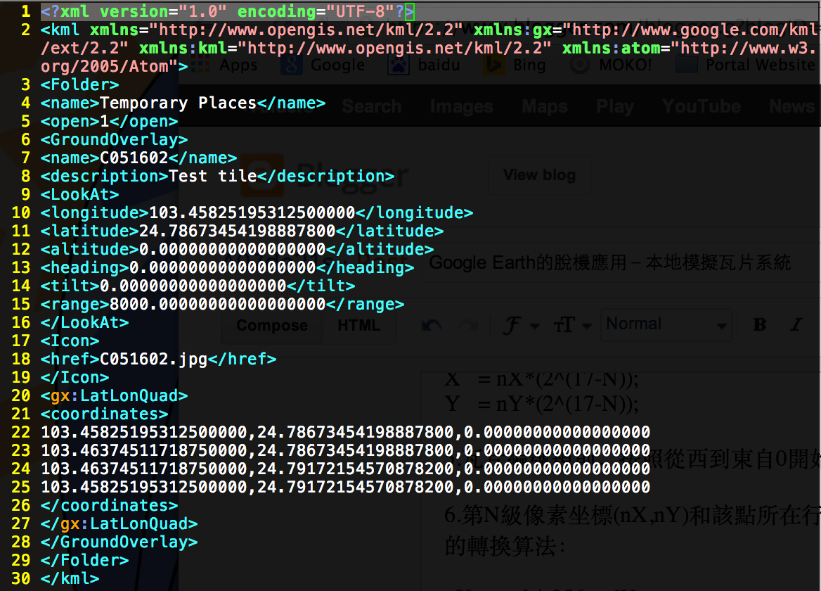 KML(Keyhole Markup Language)Keyhole標記語言,一種基於XML語法和格式,用於描述和保存地理信息的編碼規範,可以被GE識別並顯示。由KML編寫的文件稱為KML文件,KML允許通過<Icon>標簽使用圖片資源,並且允許<LookAt>標簽來定位圖片資源的加載位置,因此,我們可以通過此種方式,將KML文件模擬稱為瓦片資源,並在本地模擬一個GIS中的瓦片系統來達到GE脫機使用的需求!