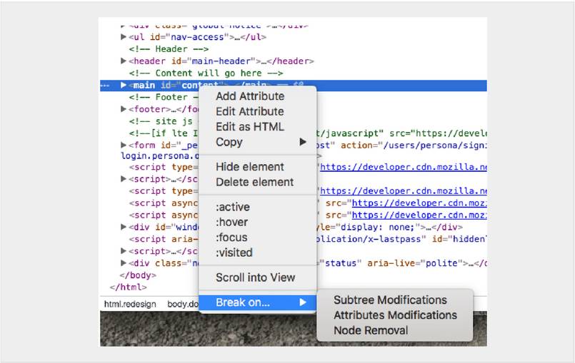 DOM是一个有趣的东西。有时候它会改变,你并不知道为什么。 但是,当您调试JavaScript时,Chrome可以在DOM元素发生更改时暂停。你甚至可以监视它的属性。在Chrome控制台中,右击该元素,然后在设置中选择中断: