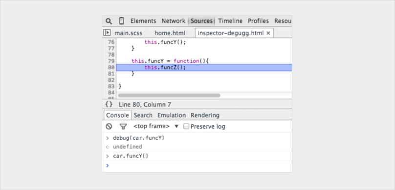 在控制台中输入debug(car.funcY),当调用car.funcY时,将以调试模式停止: