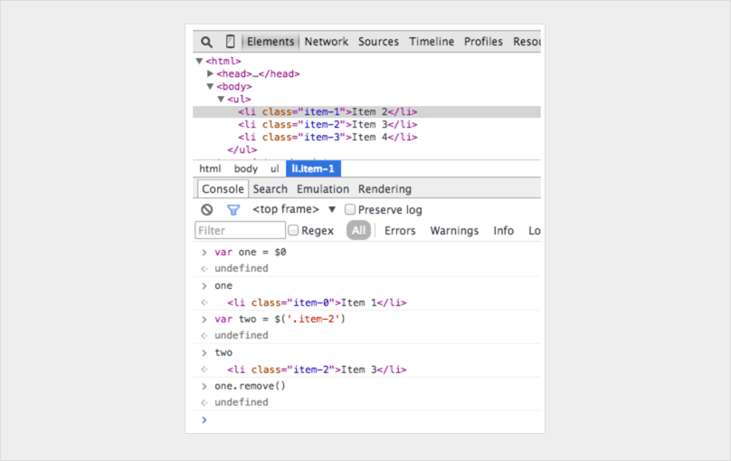 在Elements面板中标记一个DOM元素,并在控制台中使用它。Chrome控制台会保留选择历史的最后五个元素,最终选择的首个元素被标记为$0,第二个选择的元素为$1,依此类推。
