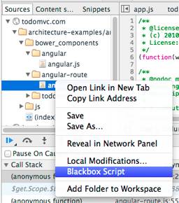 现在,我们经常在应用中引入几个库或框架。其中大多数都经过良好的测试且相对没有缺陷。 但是,调试器仍然会进入与调试任务无关的文件。解决方案是屏蔽不需要调试的脚本。当然可以包括你自己的脚本。在这篇文章中阅读更多关于调试不相关代码(https://raygun.com/blog/javascript-debugging-with-black-box/)