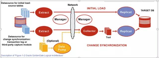 图表 1-2 表述了GoldenGate的逻辑架构,用于数据初始化加载和DDL,DML语句操作的持续化同步。这是一个基本配置,可根据业务需求变化模型配置。