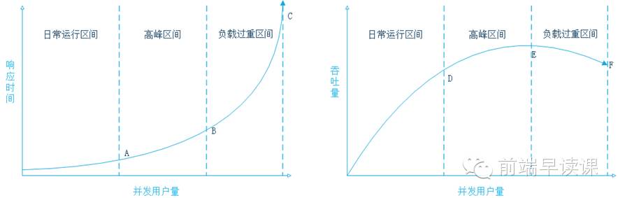 右图表示吞吐量与并发用户量的二维坐标图,可以看出,随着并发用户量的增加,吞吐量逐渐增加;在并发量到达一定量时,由于系统处理能力达到最大,吞吐量增加放缓;当并发量超过系统负载时(E点),系统处理能力开始下降,不能再请求增加的用户请求,吞吐量反而降低。