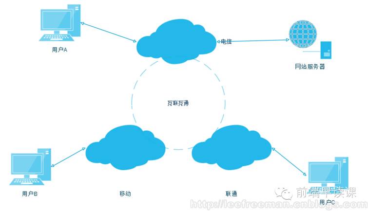 上图表示用户访问网站服务器时网络的大致情况,从图上可以看出假设网站服务器从电信网络接入,而用户A作为电信的宽带用户,则可以通过电信骨干网快速的访问到网站服务器。用户B,用户C作为移动和联通用户需要通过运营商的互联互通经过较长路径才能访问到服务器。