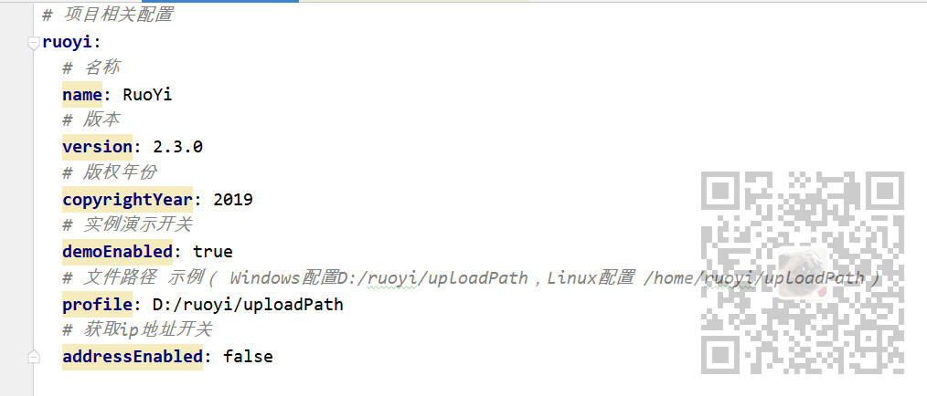 ruoyi: # 名称 name: RuoYi # 版本 version: 2.3.0 # 版权年份 copyrightYear: 2019 # 实例演示开关 demoEnabled: true # 文件路径 示例( Windows配置D:/ruoyi/uploadPath,Linux配置 /home/ruoyi/uploadPath) profile: D:/ruoyi/uploadPath