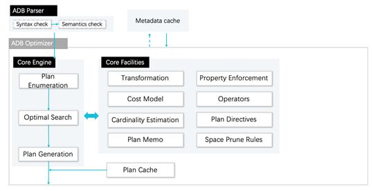 AnalyticDB的代价优化器基于Cascade模型,执行计划经过Transform模块进行了等价关系代数变换,对可能的等价执行计划,估算出按Cost Model量化的计划代价,并从中最终选择出代价最小的执行计划通过Plan Generation模块输出,存入Plan Cache(计划缓存),以降低下一次相同查询的优化时间。