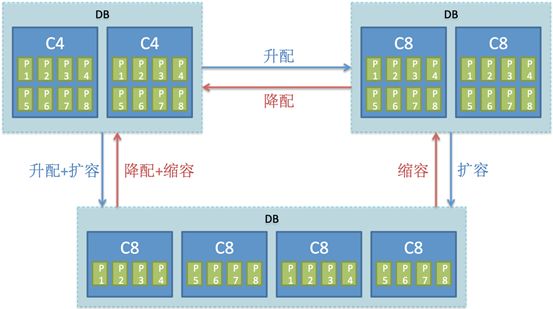 随着业务的增长,当两个C4的存储或计算资源无法满足时,用户可自主对该DB发起升配或扩容操作,升配+扩容可同时进行。该过程会按副本交替进行,保证整个过程中始终有一个副本提供服务。另外,扩容增加节点后,数据会自动在新老节点间进行重分布。