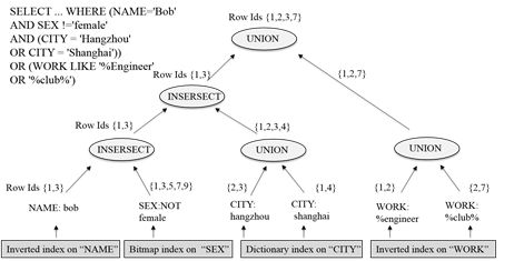 如上图所示,在倒排索引中,每列的数值对应索引的key,该数值对应的行号对应索引的value,同时所有索引的key都会进行排序。依靠全列索引,交集、并集、差集等数据库基础操作可以高性能地完成。如下图所示,用户的一个复杂查询包含着对任意列的条件筛选。玄武会根据每个列的条件,去索引中筛选满足条件的行号,然后再将每列筛选出的行号,进行交、并、差操作,筛选出最终满足所有条件的行号。玄武会依据这些行号去访问实际的数据,并返回给用户。通常经过筛选后,满足条件的行数可能只占总行数的万分之一到十万分之一。因此,全列索引帮助玄武在执行查询请求的时候,大大减小需要实际遍历的行数,进而大幅提升查询性能,满足任意复杂查询秒级响应的需求。
