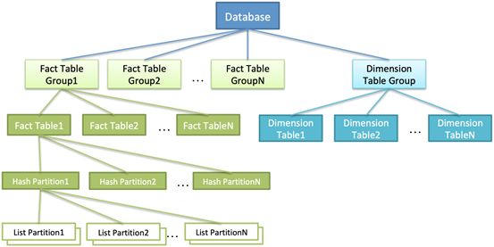 事实表创建时至少要指定Hash分区列和相关分区信息,并且指定存放在一个表组中,同时支持List二级分区。