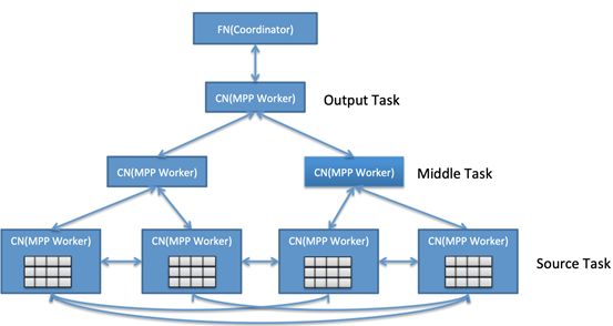 在优化器之下,AnalyticDB在MPP架构基础上,采用流水线执行的DAG架构,构建了一个适用于低延迟和高吞吐量工作负载的执行器。如下图所示,当涉及到多个表之间非分区列JOIN时,CN(MPP Worker)会先进行data exchange (shuffling)然后再本地JOIN (SourceTask),aggregate后发送到上一个stage(MiddleTask),最后汇总到Output Task。由于绝大多情况都是in-memory计算(除复杂ETL类查询,尽量无中间Stage 落盘)且各个stage之间都是pipeline方式协作,性能上要比MapReduce方式快一个数量级。