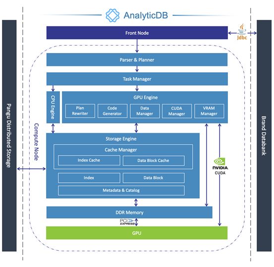 GPU加速AnalyticDB的做法是在Compute Node中新增GPU Engine对查询进行加速。GPU Engine主要包括: Plan Rewriter、Task Manager、Code Generator、CUDA Manager、Data Manager和VRAM Manager。