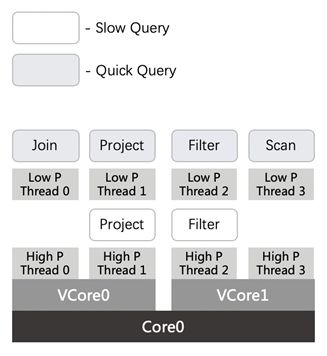 在Kernel sched模块中,对于不同优先级的线程之间的抢占机制,已经比较完善,且时效性比较高。因而,通过引入kernel层面的控制可以有效解决快查询低延迟的问题,且无需对算子的实现进行任何的改造。执行引擎让高优先级的线程来执行快查询的算子,低优先级的线程来执行慢查询的算子。由于高优先级线程抢占低优先级线程的机制,快查询算子自然会抢占慢查询的算子。此外,由于高优先级线程在Kernel sched模块调度中,具有较高的优先级,也避免了快慢查询算子在vcore层面的CPU竞争。