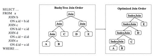 调整Join顺序时,如果大多数Join是在分区列,优化器将避免生成Bushy Tree,而更偏向使用Left Deep Tree,并尽量使用现有索引进行查找。