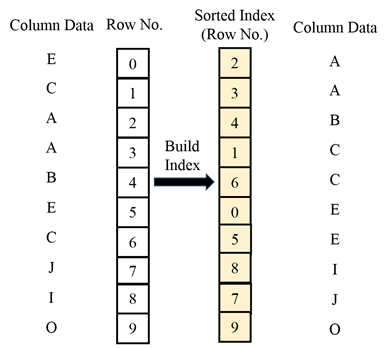 如下图所示,玄武在将实时数据以block形式刷到磁盘之前,会根据每一列的实时数据生成对应的排序索引。排序索引实际是一个行号数组,对于升序排序索引来说,行号数组的第一个数值是实时数据最小值对应的行号,第二个数值是实时数据第二小值对应的行号,以此类推。这种情况下,对实时数据的搜索复杂度会从O(N)降低为O(lgN)。排序索引大小通常很小(60KB左右),因此,排序索引可以缓存在内存中,以加速查询。