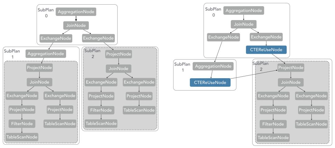 例如下图中,CTE的优化规则的实现将两部分相同的执行逻辑合为一个。通过类似于最长公共子序列的算法,对整个执行计划进行遍历,并对一些可以忽略的算子进行特殊处理,如Projection,最终达到减少计算的目的。
