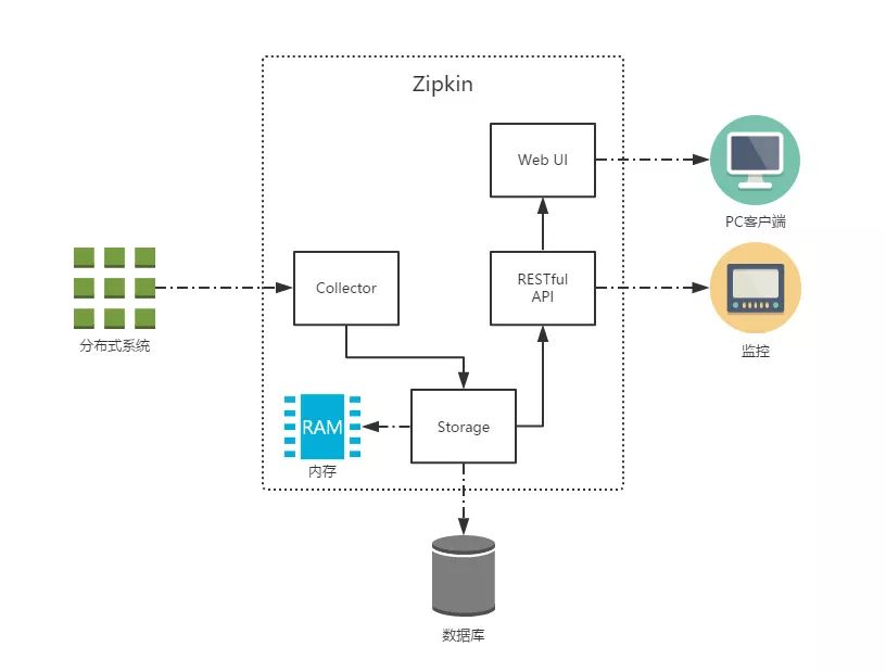 RESTful API:API 组件,它主要用来提供外部访问接口。比如给客户端展示跟踪信息,或是外接系统访问以实现监控等。