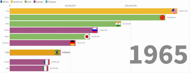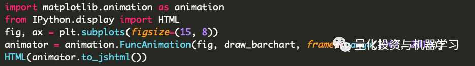 Functionatio 通过反复调用函数(在画布上绘制)来创建动画。在本例中,该函数将是 draw_barchart。 我们使用 frames,这个参数接受你想运行的 draw_barchart 的值——我们将从1968年运行到2018年。