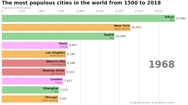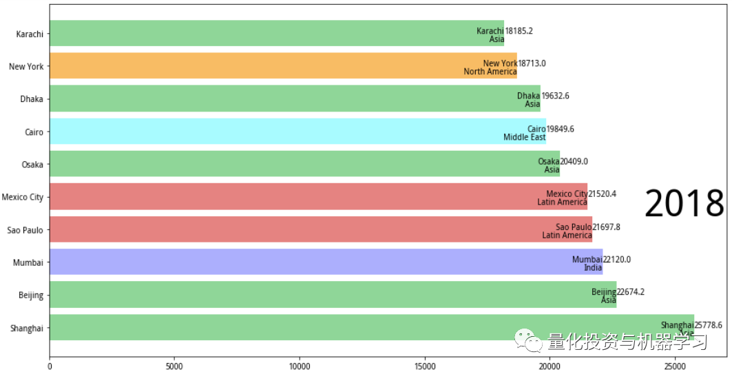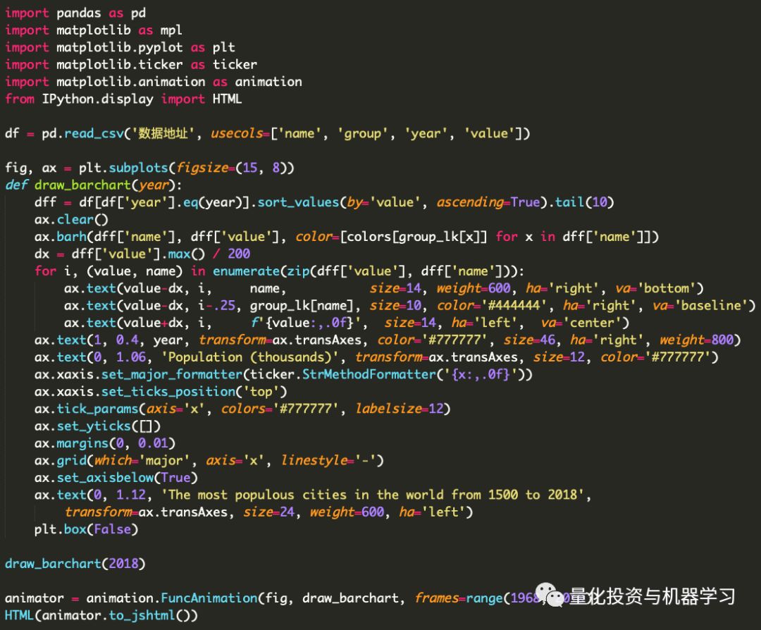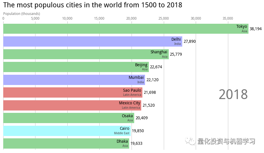 我们使用最流行的Python语言,基于Matplotlib来实现上面的动态效果。案例和数据自1500年以来世界上10个最大城市排名。