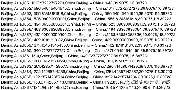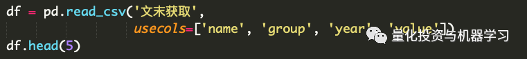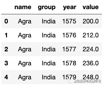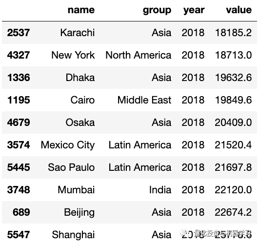 使用pandas读取相关城市人口数据集。我们只需要4列数据:'name'、'group'、'year'、'value'。一个名称映射到一个组,每年有一个值。