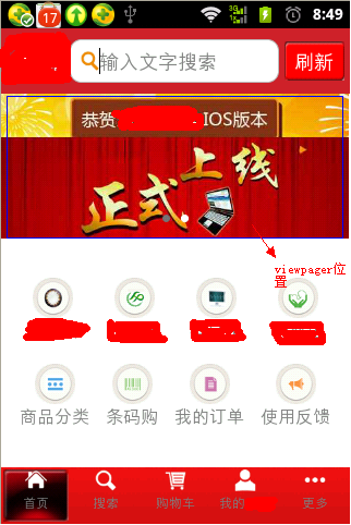 <?xml version="1.0" encoding="utf-8"?> <LinearLayout xmlns:android="http://schemas.android.com/apk/res/android" style="@style/bg" android:layout_width="fill_parent" android:layout_height="fill_parent" android:orientation="vertical" > <!-- 页面顶部布局 --> <RelativeLayout style="@style/top_bg" android:layout_width="fill_parent" android:layout_height="wrap_content" android:paddingBottom="10dp" android:paddingLeft="5dp" android:paddingRight="5dp" android:paddingTop="10dp" > <TextView android:id="@+id/text_main_refresh" style="@style/top_refresh" android:layout_width="wrap_content" android:layout_height="wrap_content" android:layout_alignParentRight="true" android:layout_centerVertical="true" /> <ImageView android:id="@+id/img_main_logo" style="@style/top_img_logo" android:layout_width="wrap_content" android:layout_height="wrap_content" android:layout_alignParentLeft="true" android:layout_centerVertical="true" /> <EditText android:id="@+id/edit_main_search" style="@style/search" android:layout_width="fill_parent" android:layout_height="40dp" android:layout_centerVertical="true" android:layout_marginLeft="5dp" android:layout_marginRight="5dp" android:layout_toLeftOf="@id/text_main_refresh" android:layout_toRightOf="@id/img_main_logo" android:clickable="true" android:editable="false" /> </RelativeLayout> <!-- 页面底部分类按钮 --> <RelativeLayout android:layout_width="fill_parent" android:layout_height="fill_parent" > <!-- 图片轮播页面 --> <RelativeLayout android:id="@+id/layout_adver" android:layout_width="fill_parent" android:layout_height="wrap_content" android:layout_alignParentTop="true" > <android.support.v4.view.ViewPager android:id="@+id/vp_main" android:layout_width="fill_parent" android:layout_height="wrap_content" /> <LinearLayout android:id="@+id/linear_point" android:layout_width="match_parent" android:layout_height="wrap_content" android:layout_alignParentBottom="true" android:layout_centerHorizontal="true" android:layout_marginBottom="10dip" android:gravity="center" android:orientation="horizontal" > </LinearLayout> </RelativeLayout> <!-- 模块布局 --> <LinearLayout android:id="@+id/layout_module" android:layout_width="fill_parent" android:layout_height="fill_parent" android:layout_alignParentBottom="true" android:layout_below="@id/layout_adver" android:gravity="center" android:orientation="vertical" android:paddingBottom="10dp" android:paddingLeft="10dp" android:paddingRight="10dp" android:paddingTop="10dp" > <LinearLayout android:layout_width="fill_parent" android:layout_height="wrap_content" android:gravity="center_horizontal" android:orientation="horizontal" android:paddingBottom="10dp" android:paddingTop="10dp" > <TextView android:id="@+id/text_module_misseye" style="@style/moudle" android:layout_width="wrap_content" android:layout_height="wrap_content" android:layout_weight="1" android:drawableTop="@drawable/misseye" android:text="@string/misseye" /> <TextView android:id="@+id/text_module_planning" style="@style/moudle" android:layout_width="wrap_content" android:layout_height="wrap_content" android:layout_weight="1" android:drawableTop="@drawable/planning" android:text="@string/planning" /> <TextView android:id="@+id/text_module_instrument" style="@style/moudle" android:layout_width="wrap_content" android:layout_height="wrap_content" android:layout_weight="1" android:drawableTop="@drawable/instrument" android:text="@string/instrument" /> <TextView android:id="@+id/text_module_baby" style="@style/moudle" android:layout_width="wrap_content" android:layout_height="wrap_content" android:layout_weight="1" android:drawableTop="@drawable/baby" android:text="@string/baby" /> </LinearLayout> <LinearLayout android:layout_width="fill_parent" android:layout_height="wrap_content" android:gravity="center_horizontal" android:orientation="horizontal" android:paddingBottom="10dp" android:paddingTop="10dp" > <!-- 商品分类 --> <TextView android:id="@+id/text_module_type" style="@style/moudle" android:layout_width="wrap_content" android:layout_height="wrap_content" android:layout_weight="1" android:drawableTop="@drawable/type" android:text="@string/type" /> <!-- 条码购 --> <TextView android:id="@+id/text_module_barcode" style="@style/moudle" android:layout_width="wrap_content" android:layout_height="wrap_content" android:layout_weight="1" android:drawableTop="@drawable/barcode" android:text="@string/barcode" /> <!-- 我的订单 --> <TextView android:id="@+id/text_module_order" style="@style/moudle" android:layout_width="wrap_content" android:layout_height="wrap_content" android:layout_weight="1" android:drawableTop="@drawable/order" android:text="@string/order" /> <!-- 使用反馈 --> <TextView android:id="@+id/text_module_feedback" style="@style/moudle" android:layout_width="wrap_content" android:layout_height="wrap_content" android:layout_weight="1" android:drawableTop="@drawable/feedback" android:text="@string/feedback" /> </LinearLayout> </LinearLayout> </RelativeLayout> </LinearLayout>代码:DisplayMetrics dm = new DisplayMetrics(); getWindowManager().getDefaultDisplay().getMetrics(dm); int tempWidth = bm.getWidth(); int tempHeight = bm.getHeight(); img.setImageBitmap(bm); RelativeLayout.LayoutParams params = (RelativeLayout.LayoutParams) layout.getLayoutParams(); params.height = (int) (tempHeight * ((double) dm.widthPixels / (double) tempWidth)); layout.setLayoutParams(params);注解:这里的img指的是imageview,bm是得到的bitmap格式的图片,layout指的是viewpager的父控件。
