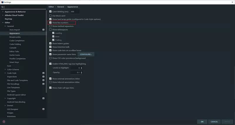 Settings -> Editor -> General -> Appearance 勾选 Show Line Numbers