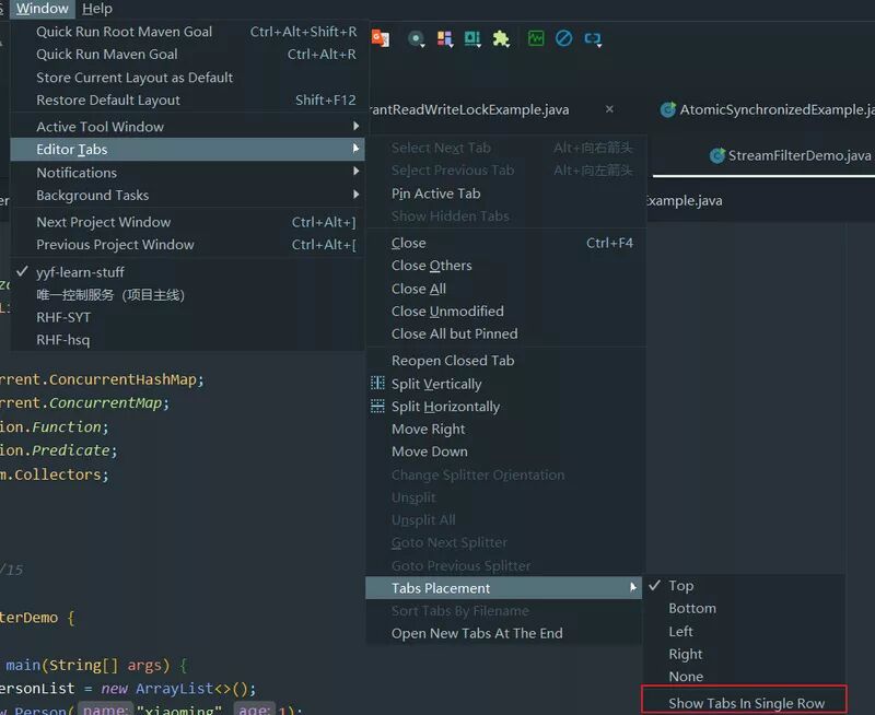 Window -> Editor Tabs -> Tabs Placement,取消勾选 Show Tabs In Single Row选项。