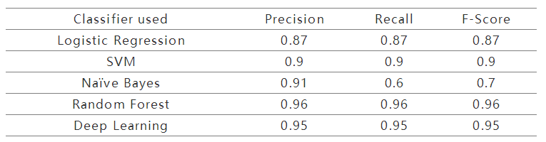 在各种分类器中,随机森林和基于深度学习的方法比其他方法更好。所示结果基于5,500个训练实例。本实验中使用数据集的大小相对小于典型的基于深度学习的系统。随着训练数据的增加,基于深度学习的系统和随机森林分类器的性能将会进一步提升。