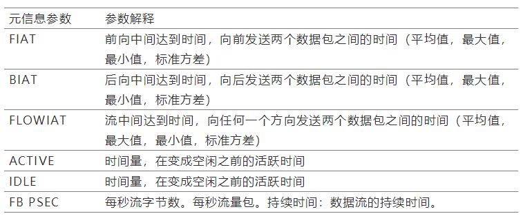 为了完成本文的数据实验,我们从纽布伦斯威克大学的Habibi Lashkari等人[11]那里获取了数据。他们的数据由从校园网络流量分析中提取的特征组成。从数据中提取的元信息如下表所示: