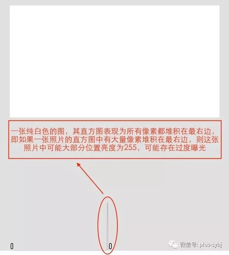 这是一张纯白色的图,在直方图里表现为全部像素都在最右边(可以理解为纯白色的区域是过曝的,细节也是丢失的,我们后期再怎么降低曝光、压暗高光都是无法找回细节):