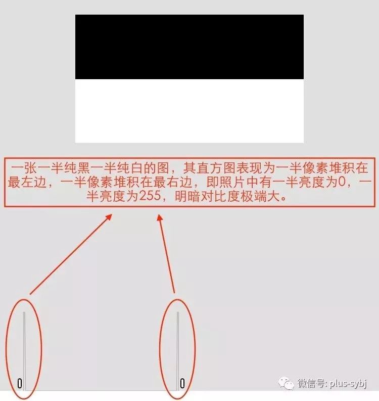 这是一张一半纯黑一半纯白的图,明暗对比度大,在直方图里表现为一半像素在最左边,一半像素在最右边: