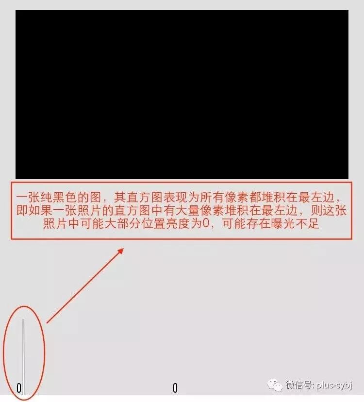 这是一张纯黑色的图,在直方图里表现为全部像素都在最左边(可以理解为纯黑色的地方是欠曝的,没有记录下任何细节,我们后期再怎么提高曝光、提亮阴影都是无法找回细节):