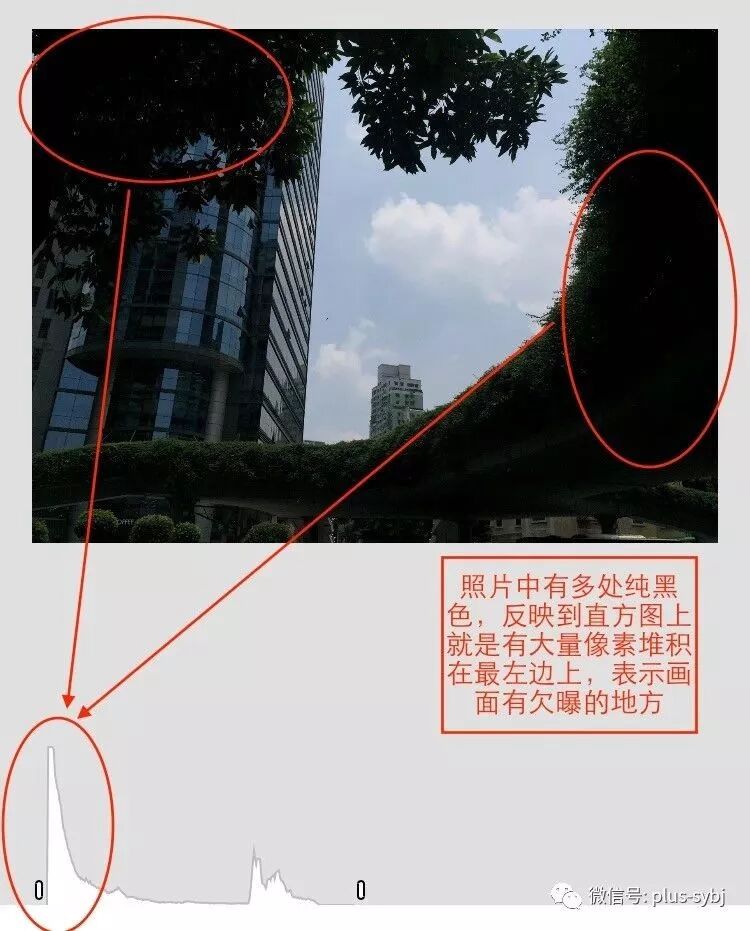这是一张严重欠曝的照片,表现在直方图上,有大量像素堆积在最左边: