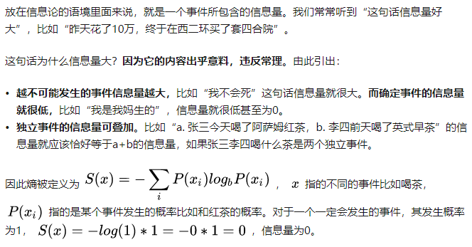 仅凭直觉来说,显而易见事件B的信息量比事件A的信息量要大。究其原因,是因为事件A发生的概率很大,事件B发生的概率很小。所以当越不可能的事件发生了,我们获取到的信息量就越大。越可能发生的事件发生了,我们获取到的信息量就越小。那么信息量应该和事件发生的概率有关。