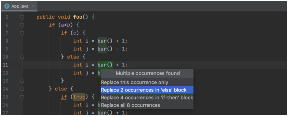 引入变量的范围:使用IntelliJ IDEA 2020.2,引入变量重构可以有选择地替换中间作用域中变量的出现。现在,您可以选择各种替换选项,而不仅限于选择一个或所有匹配项。当您将鼠标悬停在每个选项上时,编辑器会突出显示哪些事件将被新变量替换。