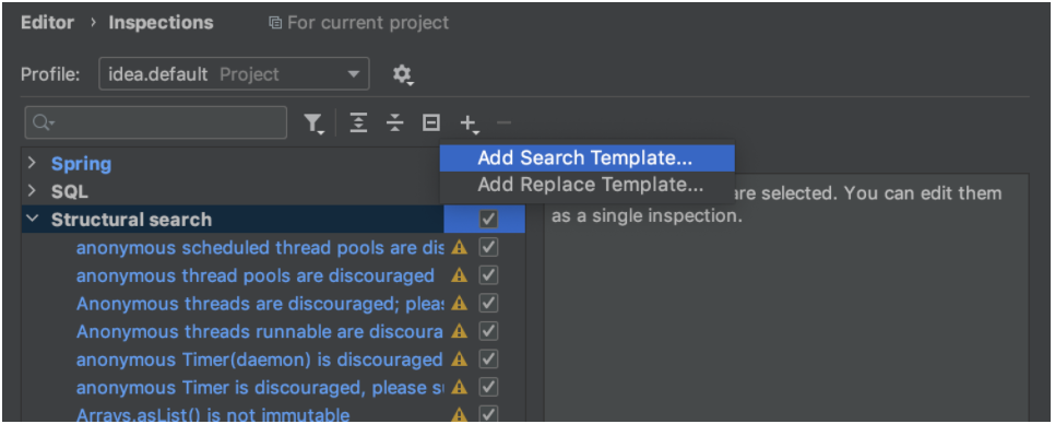能够创建多个结构搜索和替换检查:IDE允许使用“结构化搜索和替换”来查找并替换与特定模式匹配的代码块(如有必要)。使用IntelliJ IDEA 2020.2,可以创建多个结构搜索模板作为检查。对于每个SSR检查,可以指定严重性级别,添加描述以及分别启用或禁用它们。