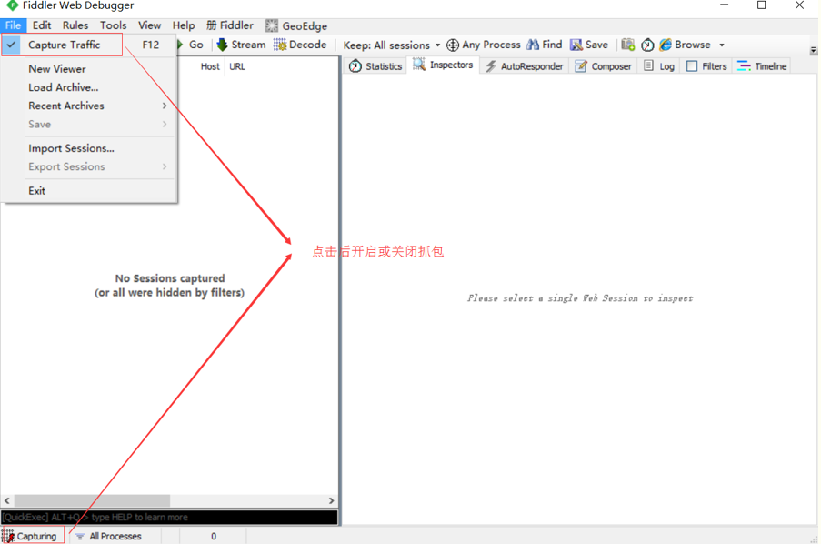 1)要使用Fiddler进行抓包,首先需要确保Capture Traffic是开启的(安装后是默认开启的),勾选File->Capture Traffic,也可以直接点击Fiddler界面左下角的图标开启和关闭抓包。