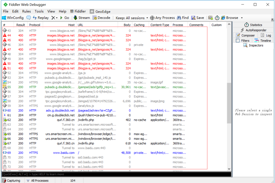 3)每个Fiddler抓取到的数据包都会在该列表中展示,点击具体的一条数据包可以在右侧菜单点击Insepector查看详细内容。主要分为请求(即客户端发出的数据)和响应(服务器返回的数据)两部分。