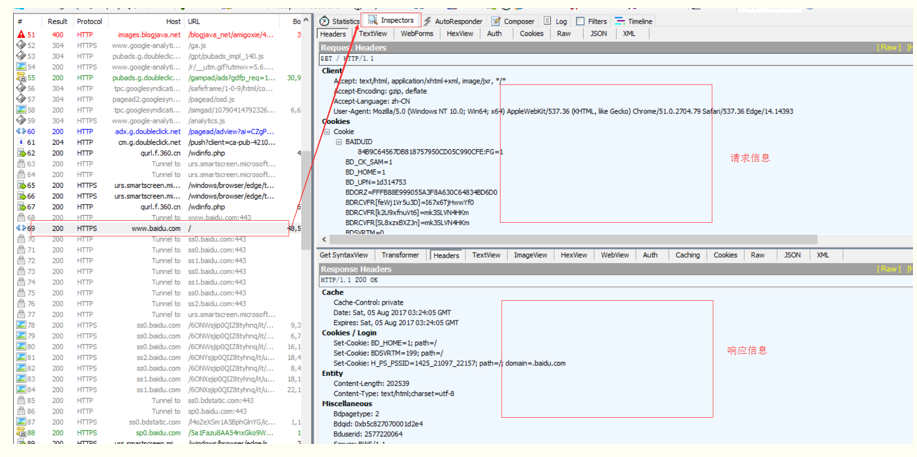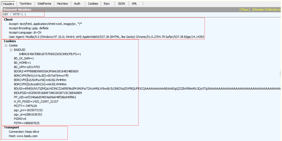 4)HTTP Request Header:以百度为例,查看请求百度主页这条数据包的请求数据,从上面的Headers中可以看到如下内容: