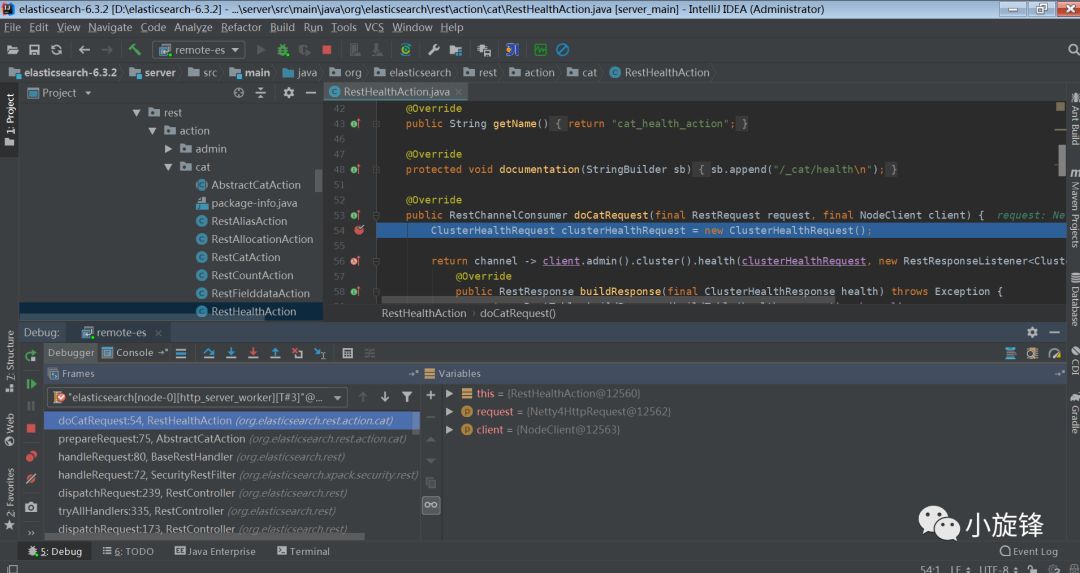 随机调试一下, 打开 elasticsearch/server/src/main/org/elasticsearch/rest/action/cat下的 RestHealthAction 类,在第 54 行出设置一个断点,然后浏览器访问 http://localhost:9200/_cat/health,可以看到断点已经捕获到该请求了