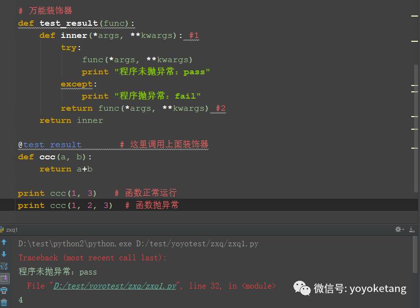 2.这个装饰器实现一个简单功能:运行一个函数,运行不抛异常,就打印pass;运行函数抛异常就打印fail