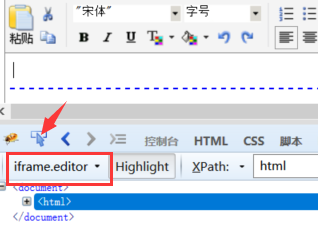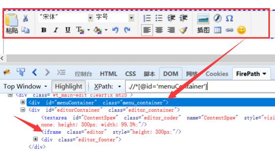 我们用箭头所指工具点击要查看的元素后,在FirePath选项卡下,方框所示的位置会有"iframe.editor"或者"iframe"的提示,这时候我们就可以确定——这是一个iframe。