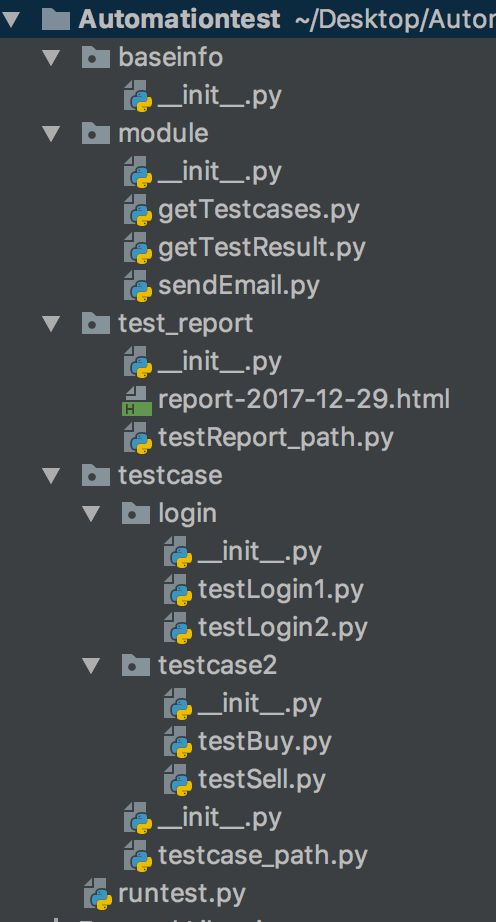 这个包下面有:__init__.py(确定它是包而不是文件夹的文件),getTestcase.py——获取测试用例文件;getTestResult.py——获取用例执行结果文件,以及sendEmail.py——发送邮件文件。这个包里放的都是封装好的方法,也就是说以后我们只需要调用这些方法就可以实现相应的功能了。