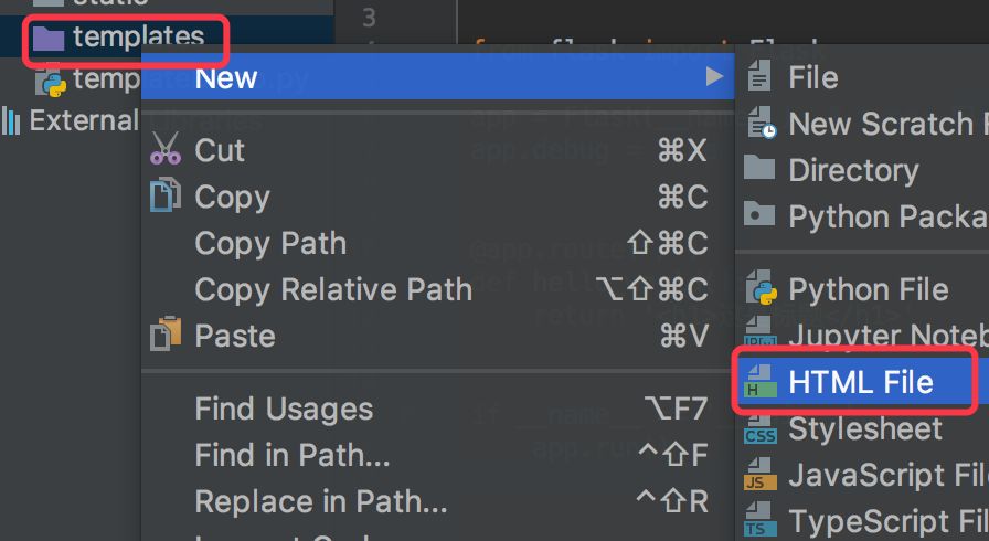 但是一般来说我们页面内容会很多,我们不可能把HTML内容放在这里乱七八糟的,所以我们可以新建一个HTML文件来存放HTML代码,我们已经知道是模板文件,所以把新建的HTML文件新建在templates文件夹下: