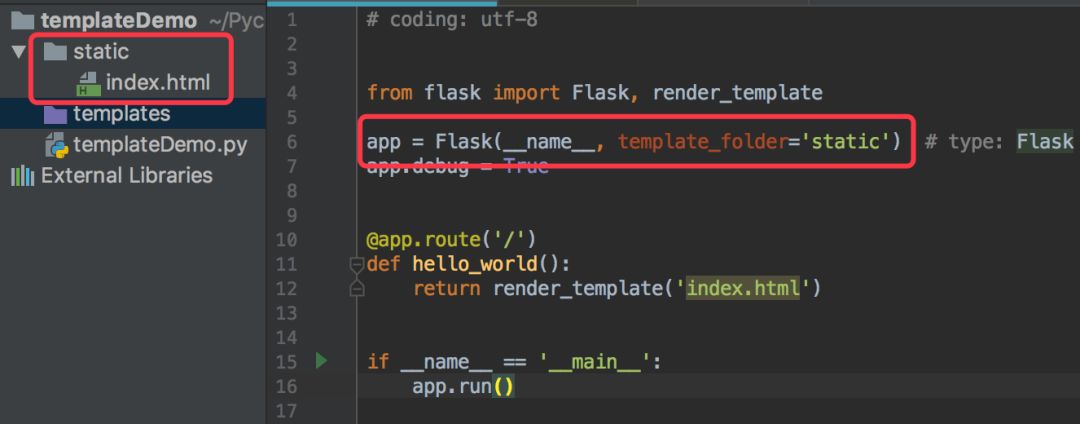 可以看到在初始化的时候它规定了模板的文件夹就是templates,所以现在改一下模板路径就很简单了——初始化的时候多传一个template_folder参数即可: