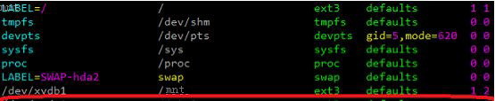 4、 如果要让这个挂载持久,需要再修改一下/etc/fstab 命令:echo "/dev/xvdb1 /mnt ext3 defaults 1 2" >> /etc/fstab
