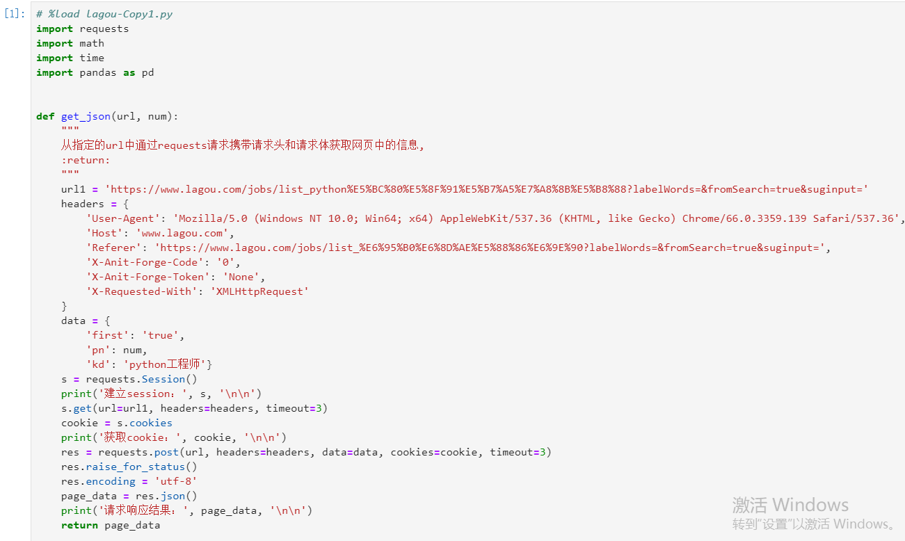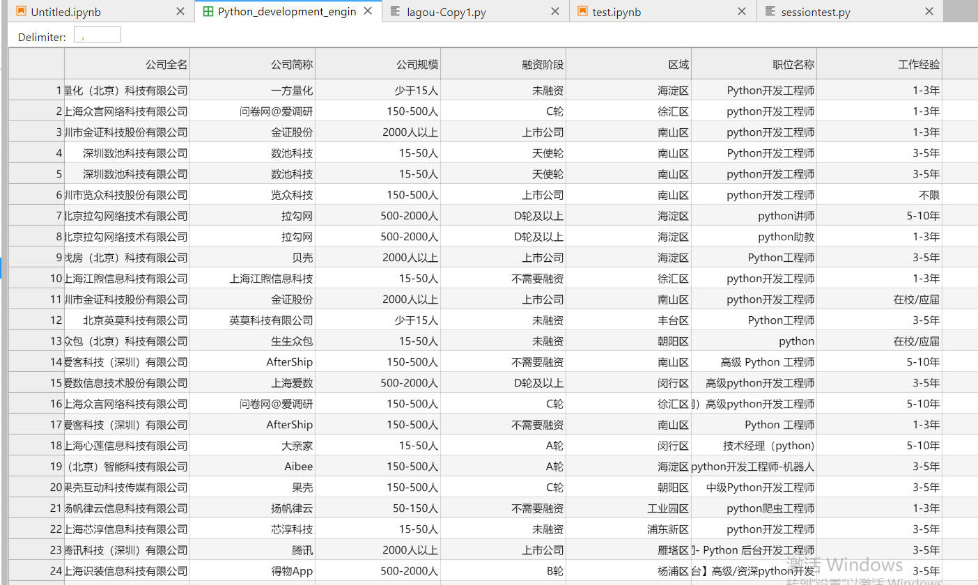JupyterLab中通过 %load lagou-Copy1.py 和%run lagou-Copy1.py运行(注:这里df.to_csv('Python_development_engineer2.csv', index=False)的.csv文件它是自己会生成的不要预先创建)