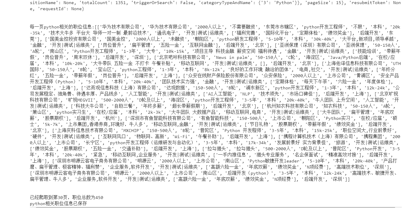 import requests import math import time import pandas as pd def get_json(url, num): """ 从指定的url中通过requests请求携带请求头和请求体获取网页中的信息, :return: """ url1 = 'https://www.lagou.com/jobs/list_python%E5%BC%80%E5%8F%91%E5%B7%A5%E7%A8%8B%E5%B8%88?labelWords=&fromSearch=true&suginput=' headers = { 'User-Agent': 'Mozilla/5.0 (Windows NT 10.0; Win64; x64) AppleWebKit/537.36 (KHTML, like Gecko) Chrome/66.0.3359.139 Safari/537.36', 'Host': 'www.lagou.com', 'Referer': 'https://www.lagou.com/jobs/list_%E6%95%B0%E6%8D%AE%E5%88%86%E6%9E%90?labelWords=&fromSearch=true&suginput=', 'X-Anit-Forge-Code': '0', 'X-Anit-Forge-Token': 'None', 'X-Requested-With': 'XMLHttpRequest' } data = { 'first': 'true', 'pn': num, 'kd': 'python工程师'} s = requests.Session() print('建立session:', s, ' ') s.get(url=url1, headers=headers, timeout=3) cookie = s.cookies print('获取cookie:', cookie, ' ') res = requests.post(url, headers=headers, data=data, cookies=cookie, timeout=3) res.raise_for_status() res.encoding = 'utf-8' page_data = res.json() print('请求响应结果:', page_data, ' ') return page_data def get_page_num(count): """ 计算要抓取的页数,通过在拉勾网输入关键字信息,可以发现最多显示30页信息,每页最多显示15个职位信息 :return: """ page_num = math.ceil(count / 15) if page_num > 30: return 30 else: return page_num def get_page_info(jobs_list): """ 获取职位 :param jobs_list: :return: """ page_info_list = [] for i in jobs_list: # 循环每一页所有职位信息 job_info = [] job_info.append(i['companyFullName']) job_info.append(i['companyShortName']) job_info.append(i['companySize']) job_info.append(i['financeStage']) job_info.append(i['district']) job_info.append(i['positionName']) job_info.append(i['workYear']) job_info.append(i['education']) job_info.append(i['salary']) job_info.append(i['positionAdvantage']) job_info.append(i['industryField']) job_info.append(i['firstType']) job_info.append(i['companyLabelList']) job_info.append(i['secondType']) job_info.append(i['city']) page_info_list.append(job_info) return page_info_list def main(): url = ' https://www.lagou.com/jobs/positionAjax.json?needAddtionalResult=false' first_page = get_json(url, 1) total_page_count = first_page['content']['positionResult']['totalCount'] num = get_page_num(total_page_count) total_info = [] time.sleep(10) print("python开发相关职位总数:{},总页数为:{}".format(total_page_count, num)) for num in range(1, num + 1): # 获取每一页的职位相关的信息 page_data = get_json(url, num) # 获取响应json jobs_list = page_data['content']['positionResult']['result'] # 获取每页的所有python相关的职位信息 page_info = get_page_info(jobs_list) print("每一页python相关的职位信息:%s" % page_info, ' ') total_info += page_info print('已经爬取到第{}页,职位总数为{}'.format(num, len(total_info))) time.sleep(20) # 将总数据转化为data frame再输出,然后在写入到csv各式的文件中 df = pd.DataFrame(data=total_info, columns=['公司全名', '公司简称', '公司规模', '融资阶段', '区域', '职位名称', '工作经验', '学历要求', '薪资', '职位福利', '经营范围', '职位类型', '公司福利', '第二职位类型', '城市']) df.to_csv('Python_development_engineer2.csv', index=False) print('python相关职位信息已保存') if __name__ == '__main__': main()