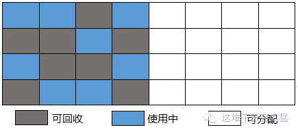 图中分为了两个部分,每次只使用其中的一部分(这里不是完全按照刚刚伊甸园和空白区的占用比例来讲,可以理解为通用版)。当这部分满了后,就会将还存活的复制到另一个区,再将这个区清空,如图: