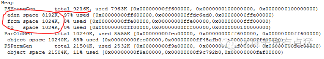 红色框的部分则是新生代中eden区和两个Survivor区的大小,可以看出他们的比例是8:1,如果设置为-XX:SurvivorRatio=3的话,结果如下