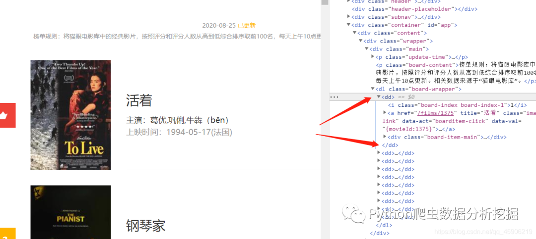 我们可以通过浏览器发现, 每个电影都在在标签dd中, 但是我们还是要根据dl标签来遍历下面的dd标签,方便得到如下数据!最后使用枚举 enumerate() 去返回一个参数字典。